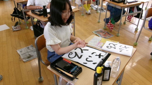 今日は毛筆「ふるさと」に挑戦しました。点画のつながりと字の形を意識して書くことが目標でした。さすが5年生と思える筆遣いで上手にできていました。
