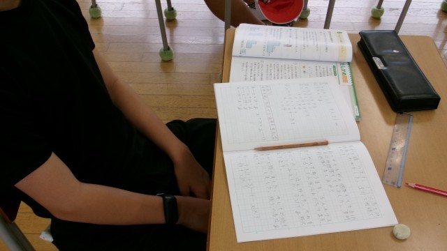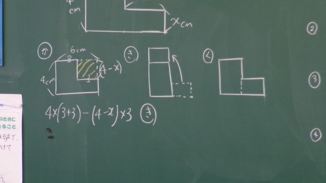 文字を使って立式し、答えを求める問題にチャレンジ。xを使い立式することに慣れてきた6年生。面積の問題も先生のアドバイスを通じてどんどん立式していました。