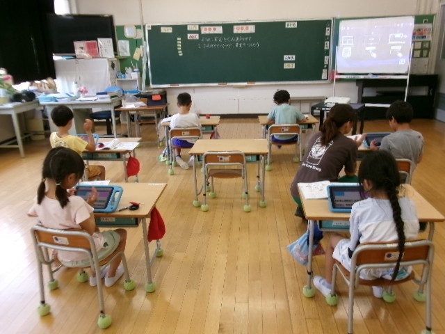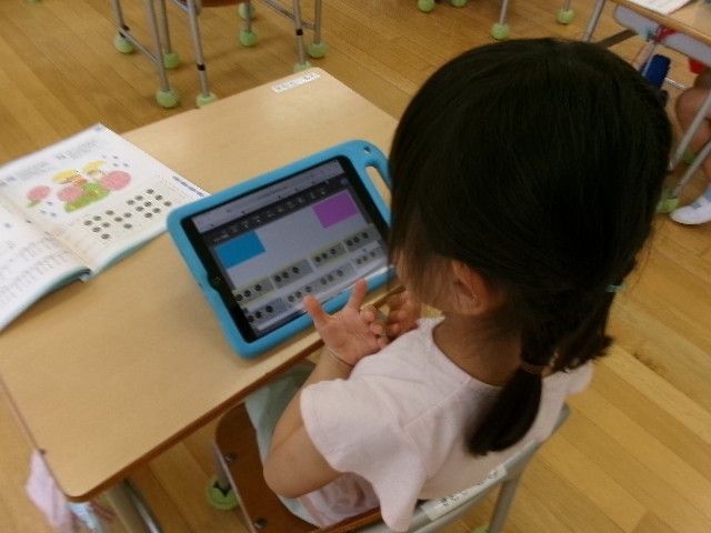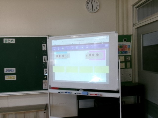 1年生は、「2つのリズムを組み合わせて自分の特別なリズムをつくる学習」をしていました。タブレットを活用してリズムをつくったり、カスタネットで打ったりしていました。「このあとは」の学習では、「タブレットで考えたリズムをタンブリンで音を出してみたい」「新しいリズムをもっとつくってみたい」と、次の学習を楽しみにしている様子でした。