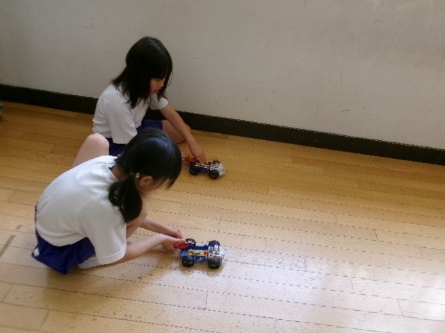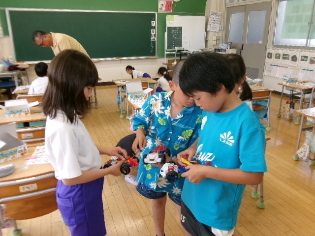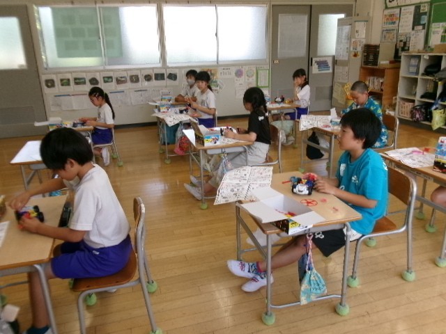 4年生は、電気の働きを活用してプロペラや車などを組み立てていました。3年生の学習を思い出しながら目を輝かせて、取り組んでいました。「車がバックに進むことも出来るよ。」と、先生が伝えると、「わかった!」と、言いながらどんどん組み立てていました。わかった児童がミニ先生になって友達に教えていました。