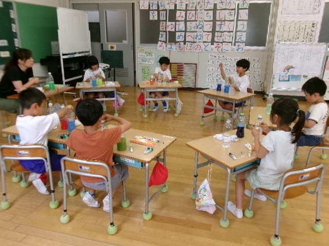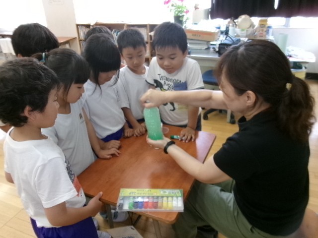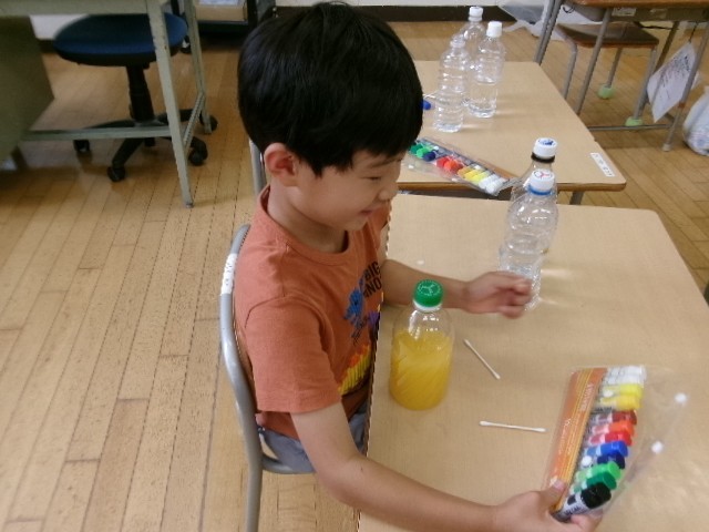1年生は、絵の具を使ってきれいな色をつくる学習をしていました。自分の好きな色を水に少し混ぜるだけで、きれいな色水ができたので驚いていました。オレンジジュースやメロンジュースのような色水になった子、素敵な青色になった子……。