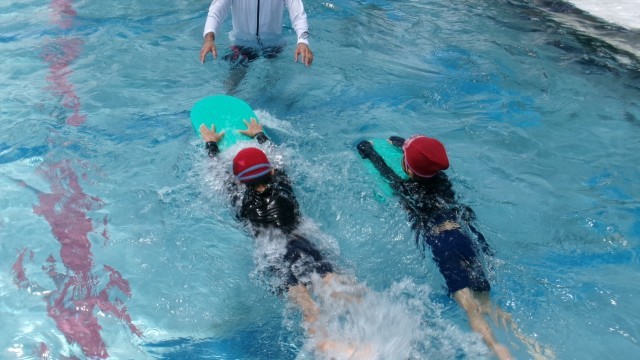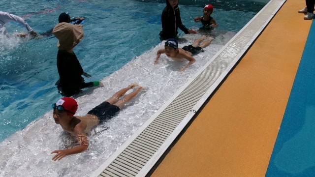 朝降っていた雨もあがり、3・4時間目はプール日和になりました。本格的にグループに分かれて泳ぎの練習をしています。