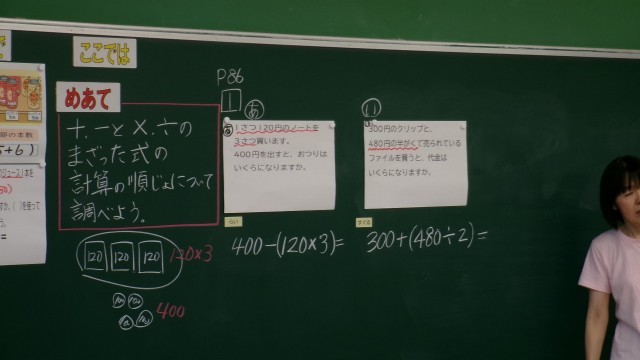 ①「1冊120円のノートを3冊買います。400円出すと、おつりはいくらになりますか。」、②「300円のクリップと480円の半額で売られているファイルを買うと、代金はいくらになりますか。」式は①400-(120×3)、②300+(480÷2)と式と答えがすぐに出ました。しかし、先生が「この式はこのままでよいのだろうか」と問いかけると「あっ」「そうか」と児童達から気づきの声が上がりました。