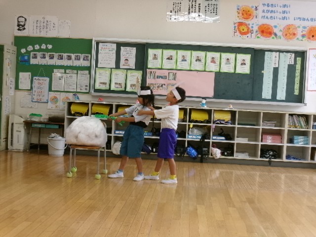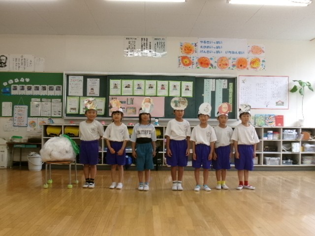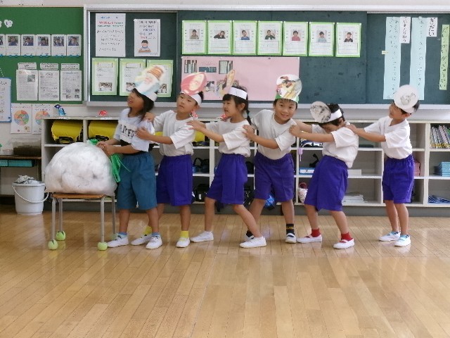 1年生は、国語で学習した「大きなかぶ」の劇をしました。教科書に載っていなくても「こんな言葉で伝えるだろう。」と想像しながら、役になりきって表現していました。7人で協力して、大きなかぶが抜けました。