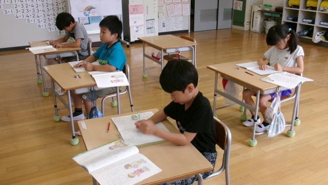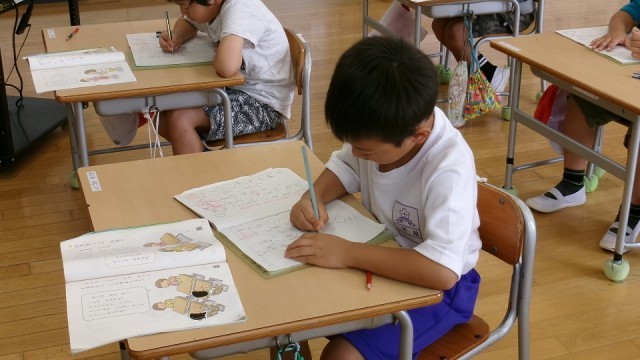 「すきなこと、なあに」の文を書くことにチャレンジしました。教科書の文をしっかり写し、ノートのマス目に沿ってしっかり書くことができました。