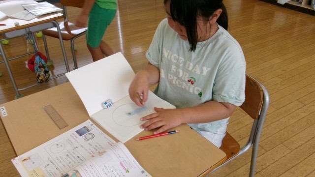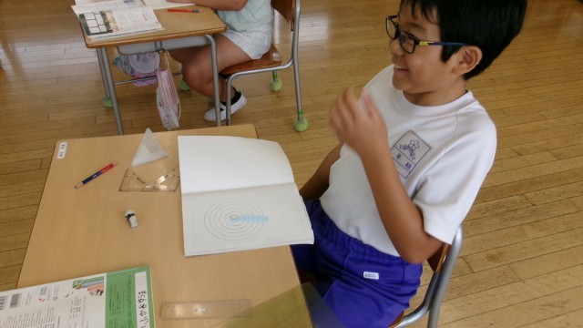 円の学習の導入です。今日のめあては「中心の点から同じ長さにならぶとどんな形になるだろう」でした。ノートに実際に描いてみると、丸い形になり、児童たちは円を初めて描いてみました。