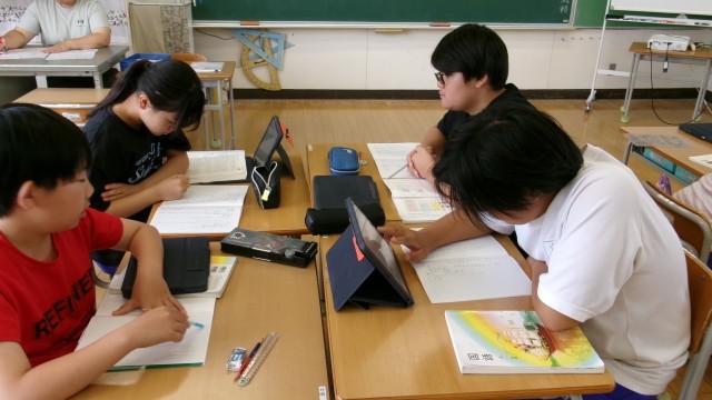 「デジタル機器」のことで課題となっているものを、児童が考え児童が調べて提案する授業です。グループで「SNSの詐欺」「子どものネット依存」などを熱心に話し合っていました。