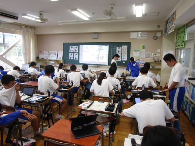 毛筆で「平和」を集中して書いていました。