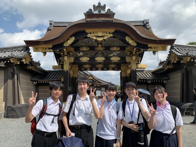 二条城唐門前です。絢爛豪華さに目を奪われています。これから二の丸御殿で大政奉還の間を見学し、歴史の舞台に立ちます!