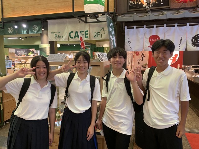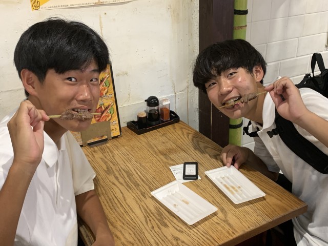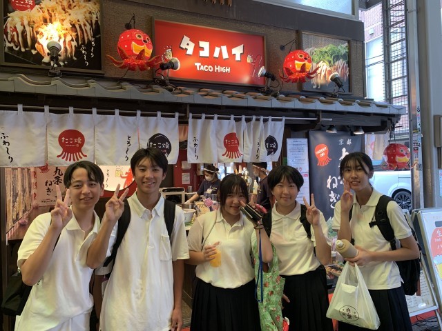 錦市場は美味しいもの天国!神戸牛に蟹、ウニもいいけど、東中生はやっぱりタコ焼きです!いや、やっぱり奮発して牛タン串いっちゃいます!