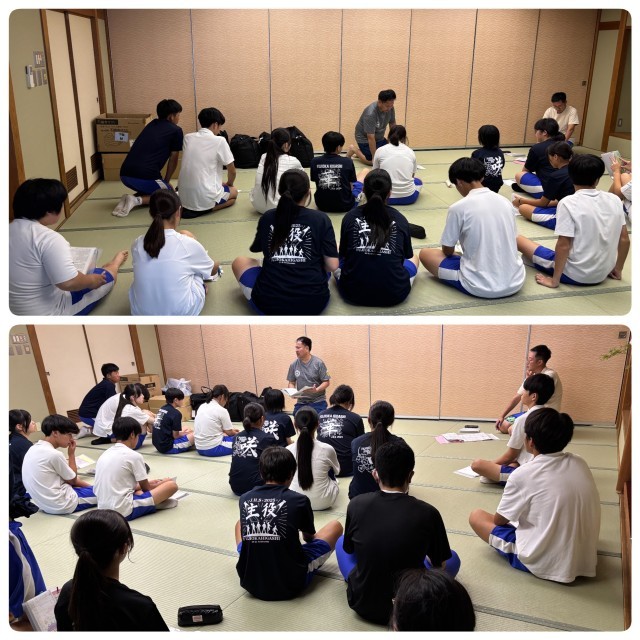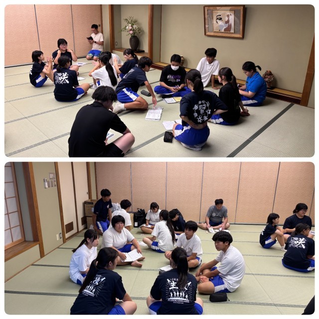帰ってきたばかりですが、班長会議をしています。班長として、心がけたこと、よくできたことなど、昨日よりも成長したことを交流しています。また、明日につながる大切なことを班に持ち帰って共有します。リーダーが熱心に集団のことを考えることが、自治につながると思います。