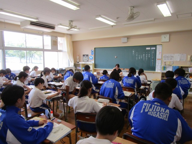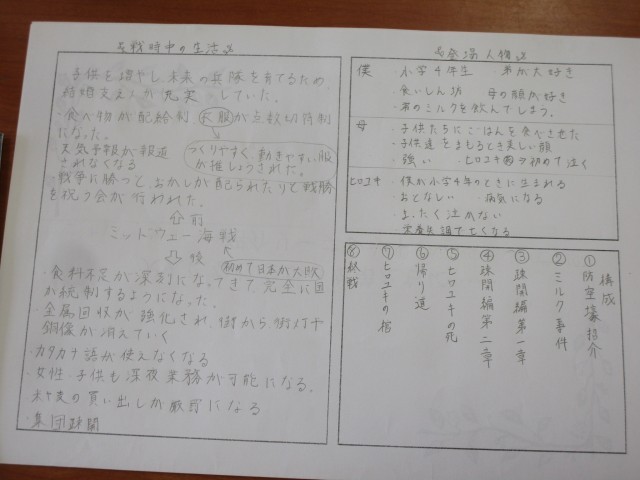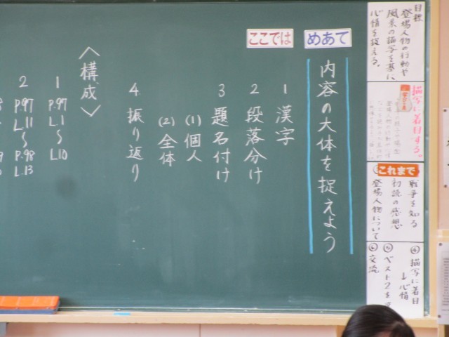 単元の目標、その目標を達成するためのポイント、学習計画などが毎時間しっかりと示されています。前時は、太平洋戦争、戦時下の国民生活など、教材の時代背景について調べることにより、登場人物の心情を捉える基礎ができるとともに学びへの意欲を高めました。本時は、教材文の内容のだいたいを捉えるというめあてのもと、全体で意見交換しながら文章の構成がどうなっているのかについて考えていました。生徒が主体となって文章の構成を考える活発な授業となっていました。