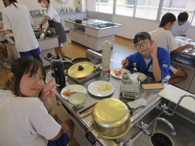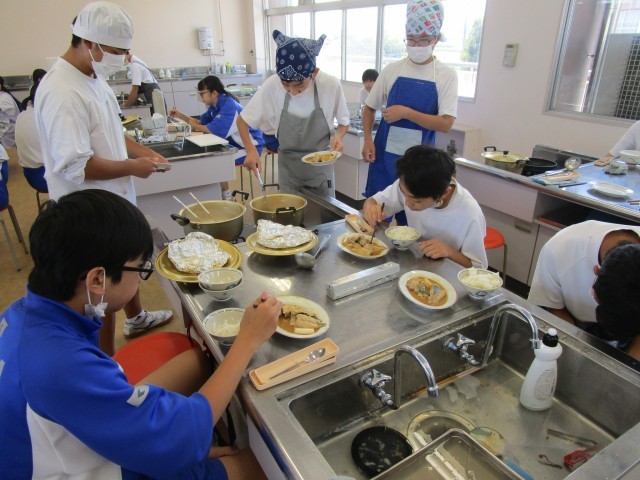 魚を使った調理をしていました。すでに試食タイムとなっていましたが、サケのムニエル、サバの味噌煮、イワシのかば焼きなど班ごとにメニューを決めたようです。サバやイワシは自分たちでさばいたとのことです。