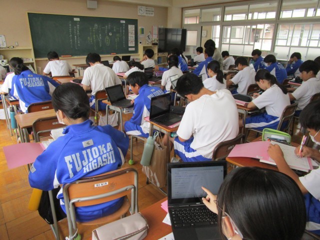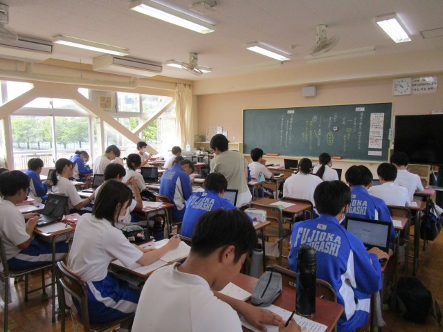 教材文「モアイは語る」の筆者の意見に対する自分の考えをまとめていました。皆真剣に取り組んでいる様子が素晴らしいです。