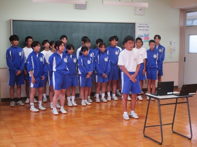 代表生徒からエールを送られると、男子チーム、女子チームのキャプテンから頼もしい宣言が述べられました。その後、「若い力」を全校で歌い、気持ちを高めていました。