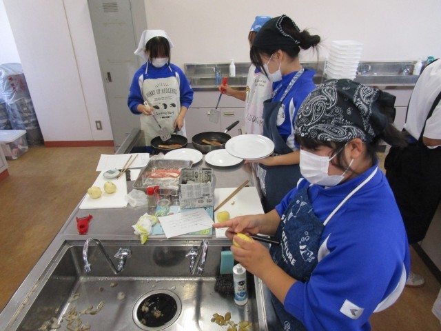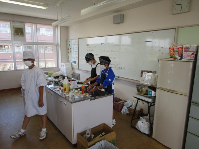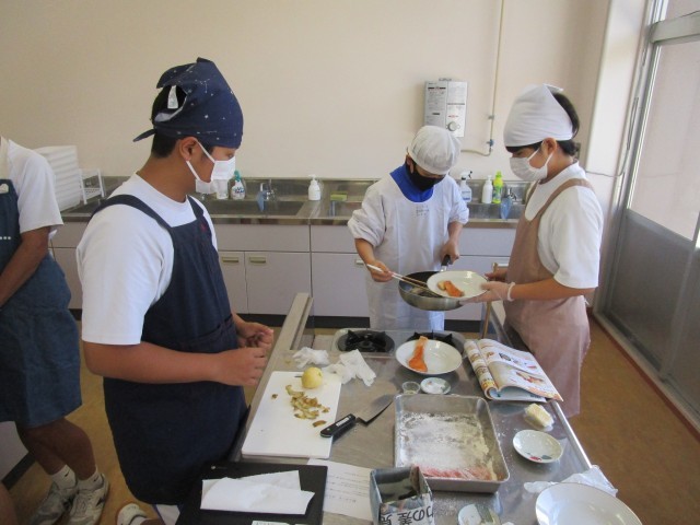 魚の調理上の特徴を考えながらの調理実習です。いわしやさば、サケを使って、つみれ汁やムニエル、かば焼きに挑戦していました。生の食材を触った手で他の場所を触らないように、また、洗い物はいつも以上に丁寧にしていました。
