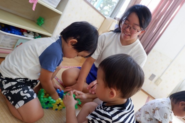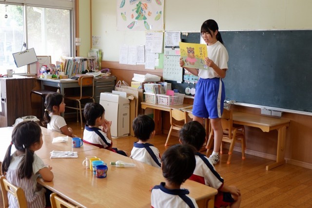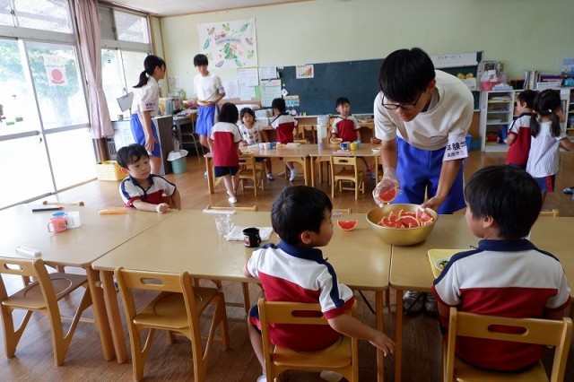 給食前にお邪魔させていただきました。生徒たちは給食の準備や準備中の読み聞かせをしていました。子どもたちの目線に合わせて給食を渡していました。