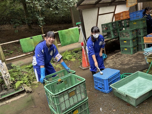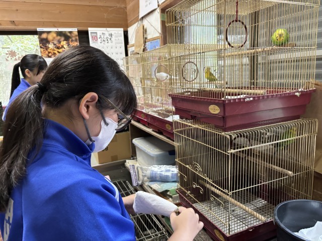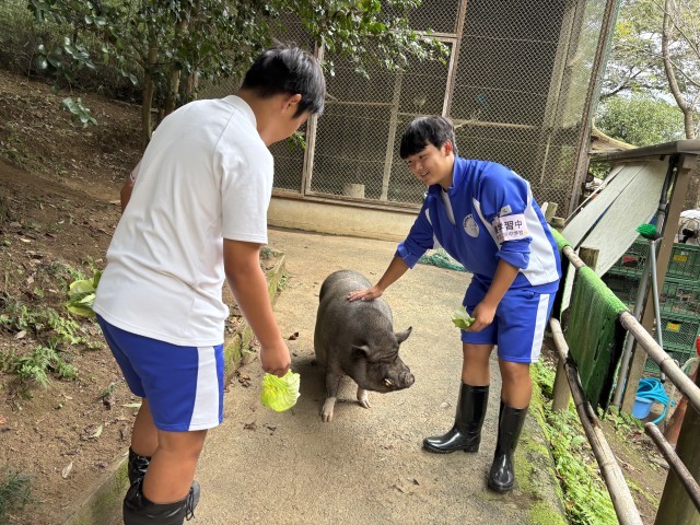 庚申山にあるミニ動物園では、ミニブタの文ちゃんやモルモット、インコなどの世話を頑張っていました。餌をあげるだけでなく、清掃や力仕事もすすんで行っているとスタッフの方からお褒めの言葉をいただきました。かわいい動物に囲まれて充実した体験になっているようです。