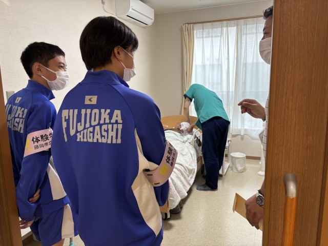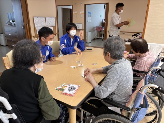 特別養護老人ホーム「ライフゆうかり」では、2名の生徒がお世話になっています。利用者さんの髪の毛を乾かしたり、一緒にレクリエーションをしたり、按摩マッサージの様子を見学したりしていました。利用者さんが昼間たくさん活動して、夜にぐっすり寝られるように職員さんは工夫して計画を立てて活動しているため、次々と一緒に行動していました。