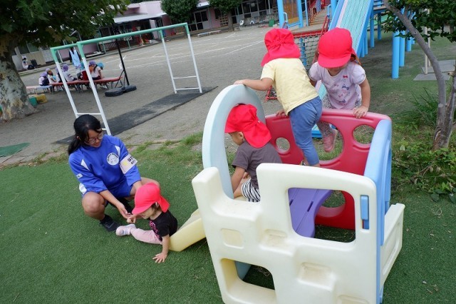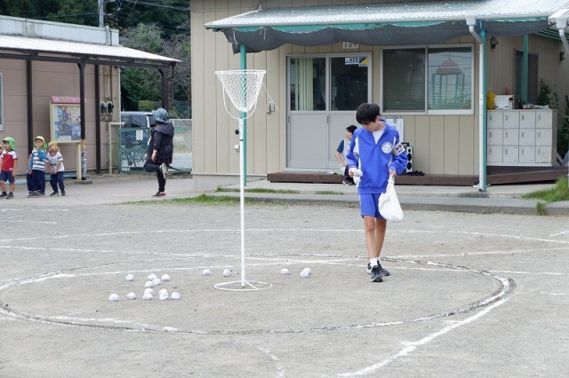 美九里西保育園では、運動会の練習をしていました。器具を準備するときには、中学生がさっと動いて大きな器具を設置してくれていました。小さい子たちを見ている生徒は遊具で遊ぶ補助をしてあげていました。生徒たちは「楽しい。もっといたい。」と話していました。