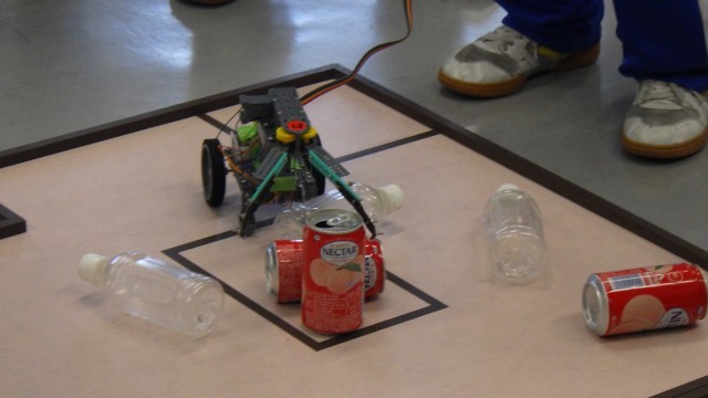 様々な障害物を乗り越えながら、缶やペットボトル、テニスボール、ゴルフボールなどを所定の場所に運んで得点を競います。制限時間は3分間しかなく、的確な操作はもちろんのこと、作り上げてきたロボットがトラブルなく動くことが勝敗のカギとなります。