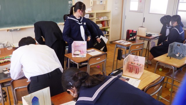 これまで時間をかけて制作してきた「My shop」が完成したので、生徒同士で鑑賞していました。仲間の作品の良い点などを積極的に評価し合っていました。