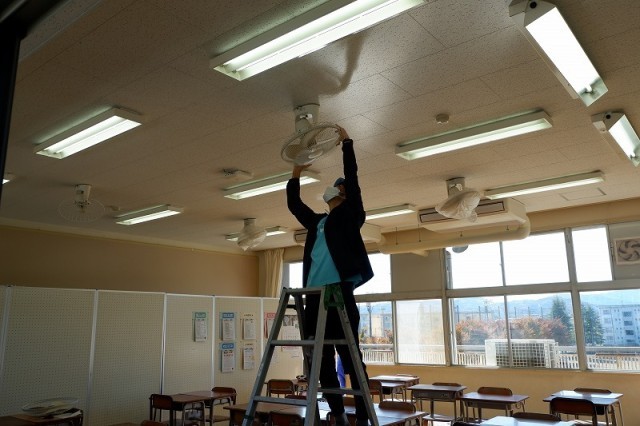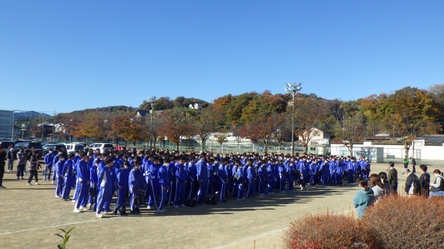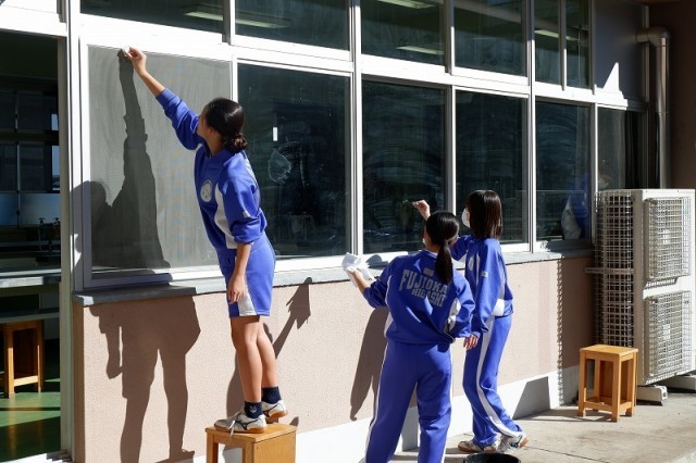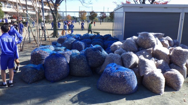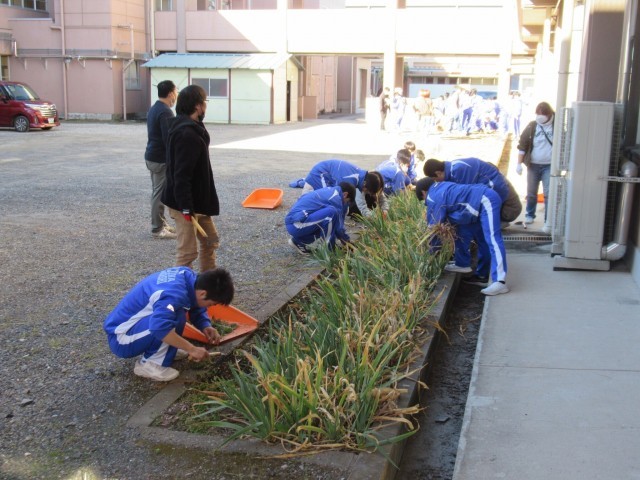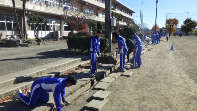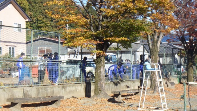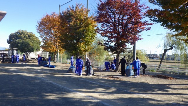 東中学校校庭に多くの保護者の皆様、生徒、教職員が集合し、PTA親子環境整備作業が行われました。校庭では、秋の終わりを告げるように舞い散る枯葉を隅から隅まできれいにし、側溝にたまった土を掻き出し、伸び放題だった植栽を整えました。校舎内では、窓ふきやエアコンのフィルター清掃、換気扇のほこりとり、新たにカーテンを取り付けるなどを行いました。普段できなかったところにまで細かに掃除をしてくださり、大変ありがたかったです。また、親子で一緒に掃除を行う姿がとても微笑ましく、心の中まできれいになったようでした。