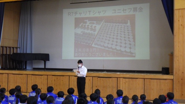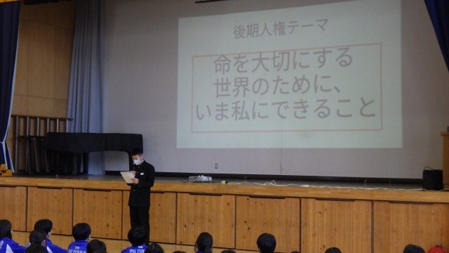 校長先生からの人権講話では、だれもがまだまだ成長途中であることを自覚し、よりよい生き方を見つけていくことの大切さを語ってくださいました。その後、後期人権集中学習旬間のテーマ「命を大切にする 世界のために、いま私にできること」の発表、東人権サミットの報告、募金活動(チャリTシャツ、赤い羽根など)の報告がありました。また、人権ソングの発表があり、心にしみる楽曲に生徒の心も引き締まっていました。
