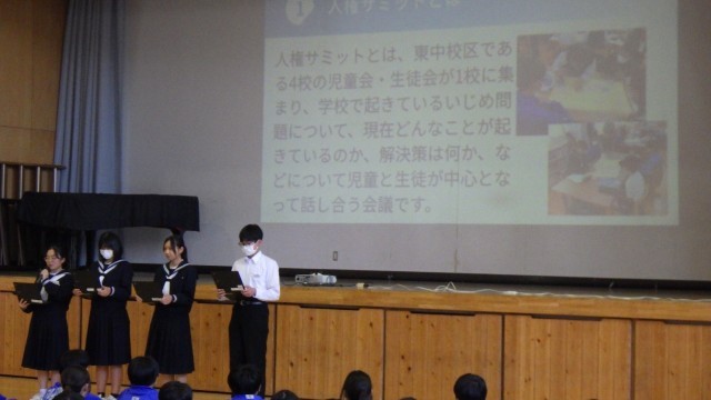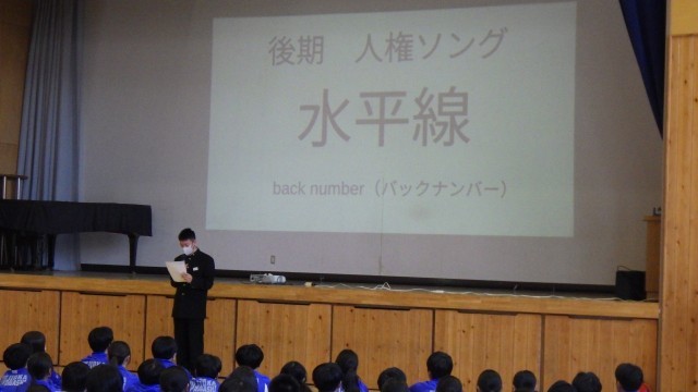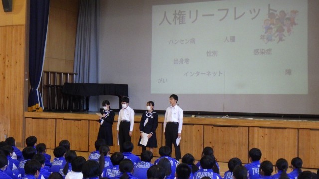 後期人権集中学習旬間オープニングが行われました。今日から15日(月)までのおよそ2週間、人権について深く学んでいくとともに、身近な問題である「いじめ問題」の解決方法について、みんなで考えていきます。