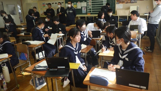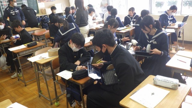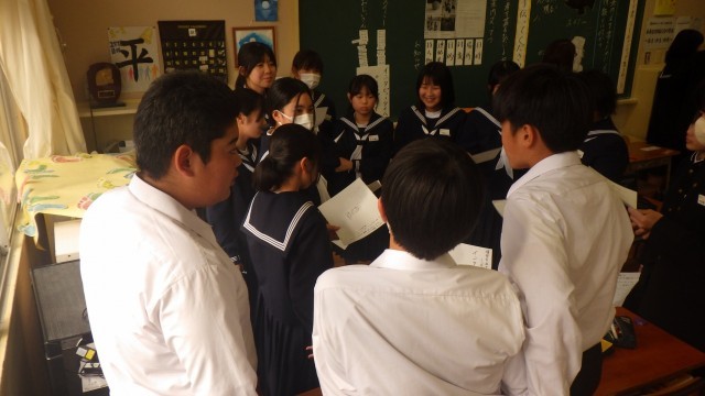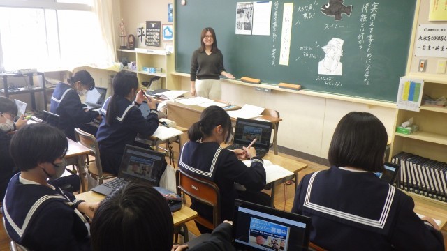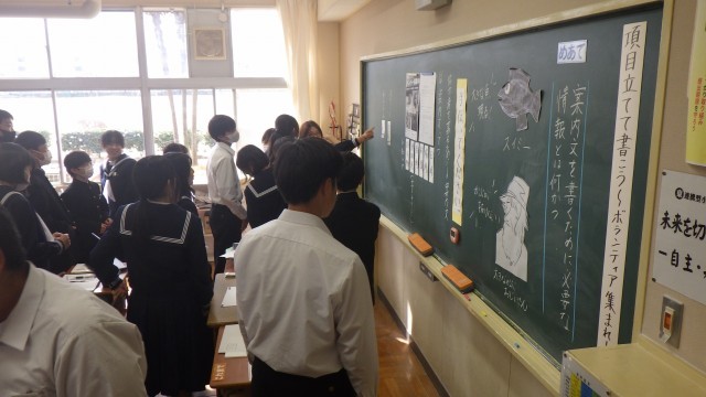 校内研修の研究授業として1年生国語の授業が行われました。案内文を書くための情報を集め、整理して、実際に案内文を作成するという授業です。小学校の時に学習した教材である「スイミー」や「おおきなかぶ」と関連付けながらの導入で、生徒はワクワクした気持ちで前のめりになって授業に入り込んでいきました。生徒のやる気に満ちた様子が終始見られ、あっという間の50分でした。案内文に必要な項目や情報がわかってきましたので、次の時間はいよいよ案内文の作成ですね。