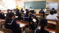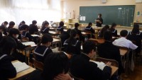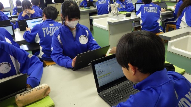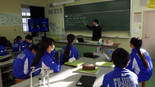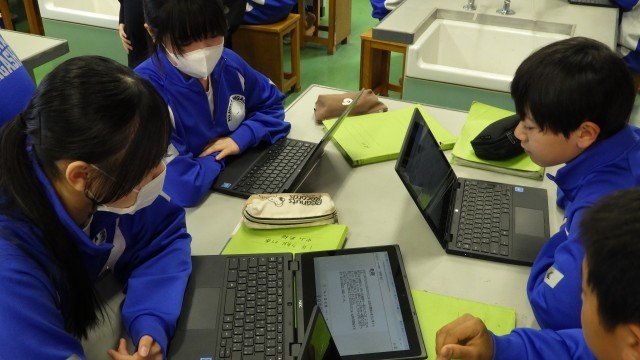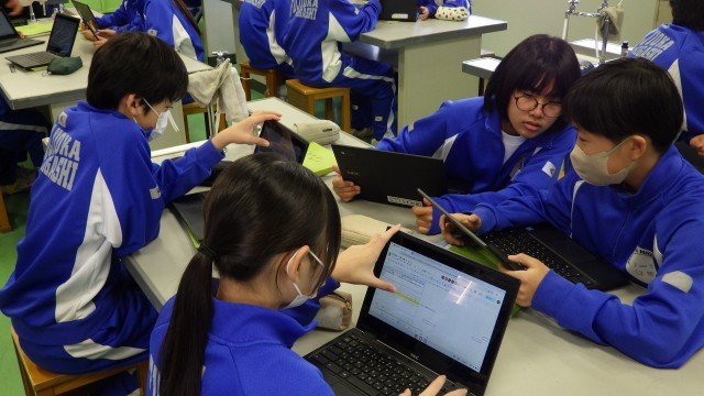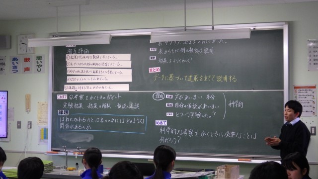 ばねの伸びは加えた力の大きさに比例するという法則を学習しています。生徒は実験データをもとに考察を書くわけですが、それをより科学的なものにすることが本時のねらいです。科学的な考察にするためのポイントを押さえたうえで、すでに各自が書いた考察を評価してみると、、、足りないところやあいまいな表現があることに気づきます。生徒は、より科学的な考察にレベルアップすべく一生懸命に考えていました。