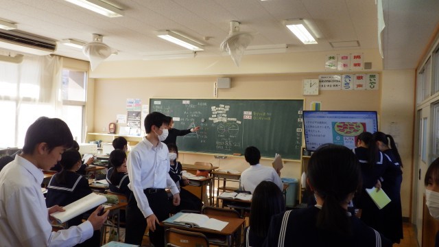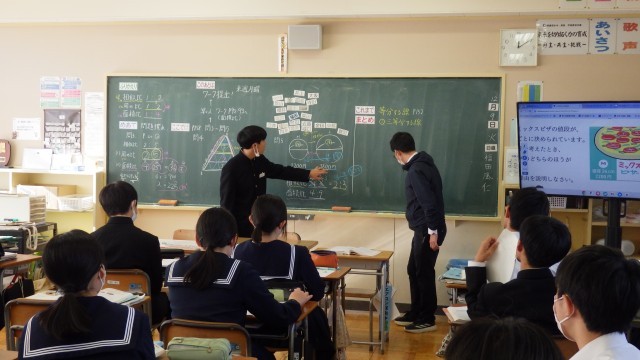 相似比を使って、大きさと値段の違う2種類のピザのお得度について考察していました。ピザの面積比と価格の比を比べてどちらがお得か!生活にばっちり生かせそうですね。