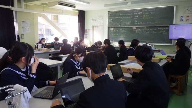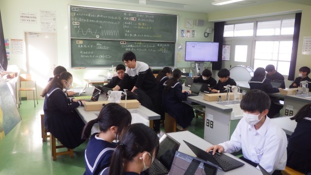 音の大きさと波形について実験をもとに考察をしていました。データをもとに、どんな結果からどのようなことが言えるのかなど、生徒はこれまで学習してきた考察の書き方をもとに考えていました。