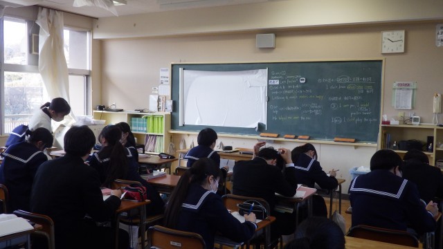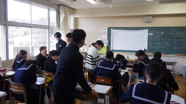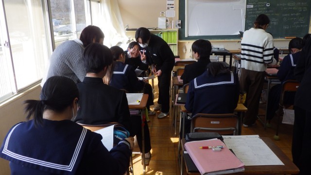 英語のプリントによる復習問題に取り組んでいました。皆、真剣に仲間と相談しながら頑張っていました。