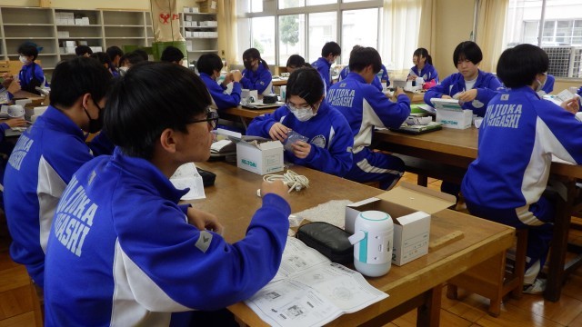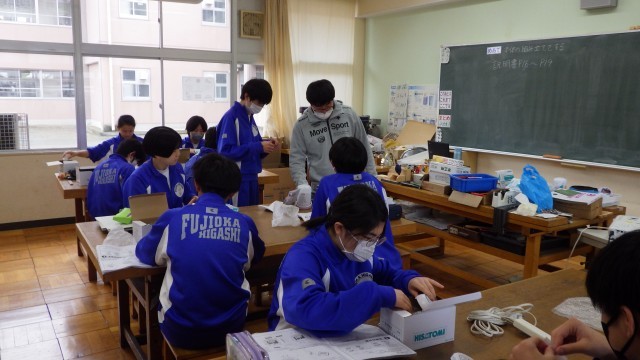 災害時にも役立つワイヤレスランタンの製作に取り組んでいました。電子部品などをはんだづけした基盤を本体に固定しますが、その前に動作テストを行っています。完成まであとわずかです。