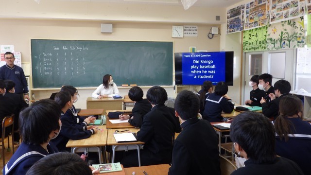 2年生を担当している教師に関するクイズが英語で出題され、グループで話し合って英語で回答を考えていました。全員が楽しそうに取り組んでいました。