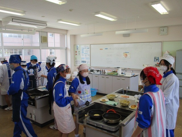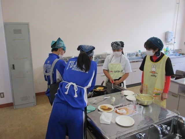 北校舎からすごくいい匂いがしたので調理室に行ってみると、計量と火加減の練習ということで、ホットケーキを焼いていました。