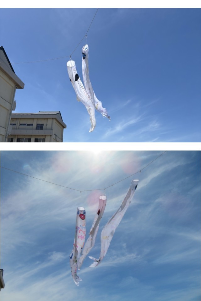 本校の生徒は、手作りこいのぼりのブースで活動していました。部活動で製作した、大きな真っ白い鯉のぼりに会場に来ている子供たちと、絵を描いたり、色を塗ったりと楽しく活動できました。最初は2匹で泳いでいたこいのぼりは、3匹に増えました!