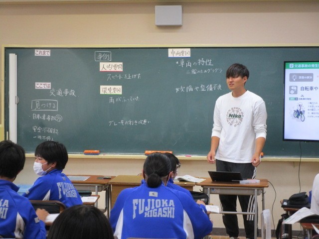 交通事故の防止について学習していました。事例をもとに、事故の要因はどこにあったのかを分析して、自分の生活に生かします。