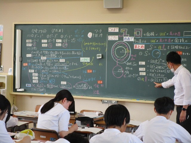 乗法の公式や因数分解を利用して、目的に合うように式を変形する学習です。前時で学習した、幅が一定の図形の面積は(幅)×(中央を通る線の長さ) で求められることを他の図形でも適用できるか考えていました。