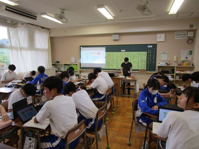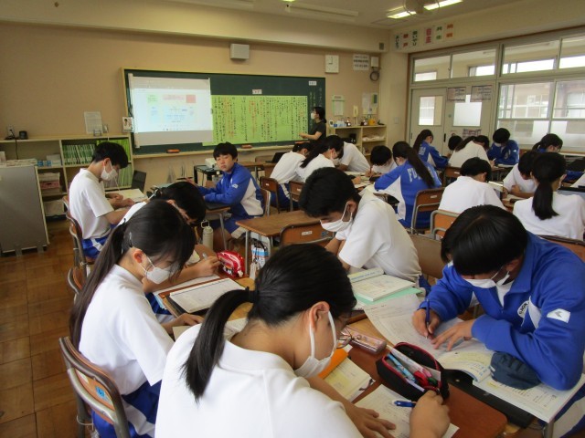 教材文について、抽象と具体など、作者の表現の工夫に対する感想を生徒一人一人がワークシートに書いていました。