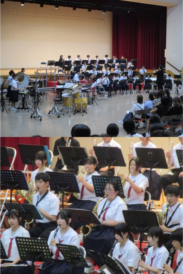 市民ホールにて、第36回定期演奏会を開催しました。たくさんの保護者や卒業生、地域の方にご来場いただき会場はほぼ満席となりました。第1部オリジナルステージ、第2部アンサンブルステージ、第3部ポップスステージ、そして入部2ヶ月の1年生の出番もありました。第1部は昨年度・今年度のコンクール演奏曲を披露し8月に控える県吹奏楽コンクールへの意気込みを感じさせてくれました。第2部では、木管、金管、打楽器それぞれ数人によるアンサンブル曲を奏でてくれました。第3部では、カラフルな装いで楽しいポップスステージを演出し、会場との一体感は最高潮となりました。吹奏楽部の皆さん、楽しいひとときをありがとうございました。