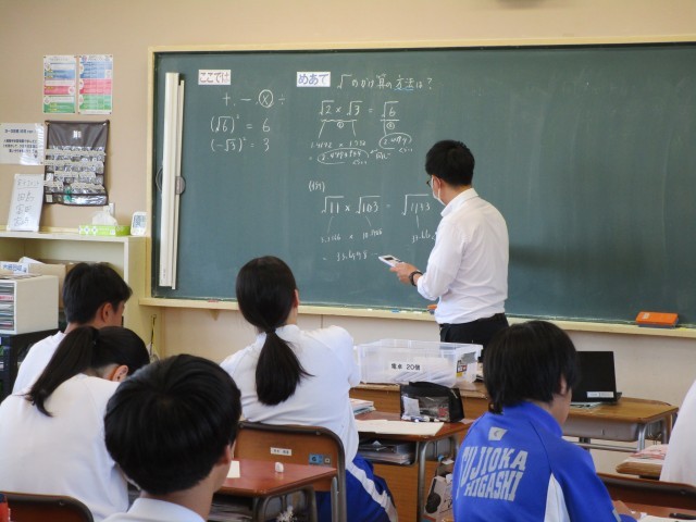 平方根同士の乗法について考えていました。例えば、√2✕√3は√6で本当によいのか?ということについて、計算機を使って平方根の近似値を出して、およそ正しいかどうかを確かめていました。
