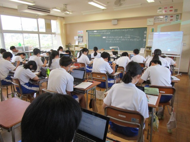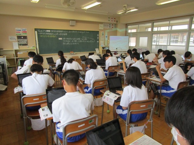 生徒は皆、課題に対して真剣に向き合っていました。「日本が他国から武力攻撃されたとき、アメリカはどこまで本気で日本を守ってくれるか?」について自分の考えをまとめていました。なかなか難易度の高い課題ですね。
