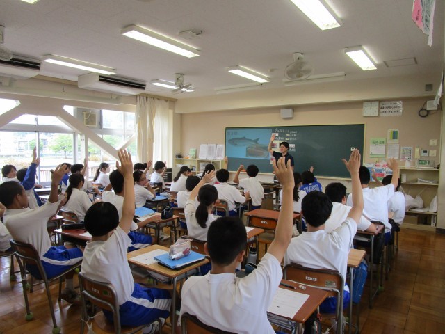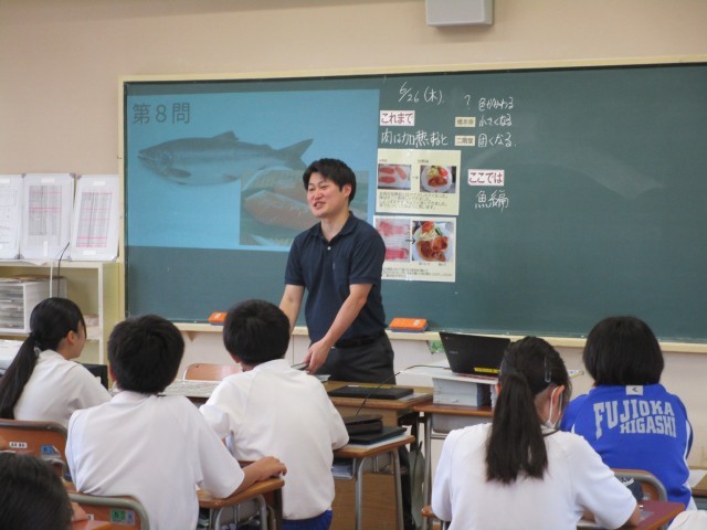 魚の調理実習に向けて、「お魚クイズ」から始めました。生徒も興味津々で学ぶ意欲を高め、本題に入っていました。