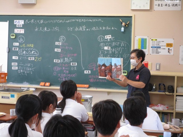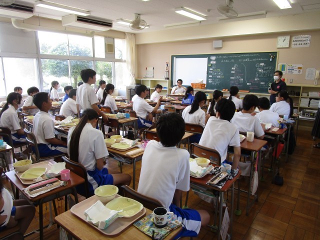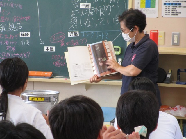 毎週水曜日の給食の時間は、読み聞かせボランティアの日です。今日は「ばけものつかい」という落語絵本を読んでいただきました。落語界では、有名な噺で、誰もが楽しめる演目のようです。読み聞かせの放送が終わった後は、1年3組の生徒と交流していただきました。