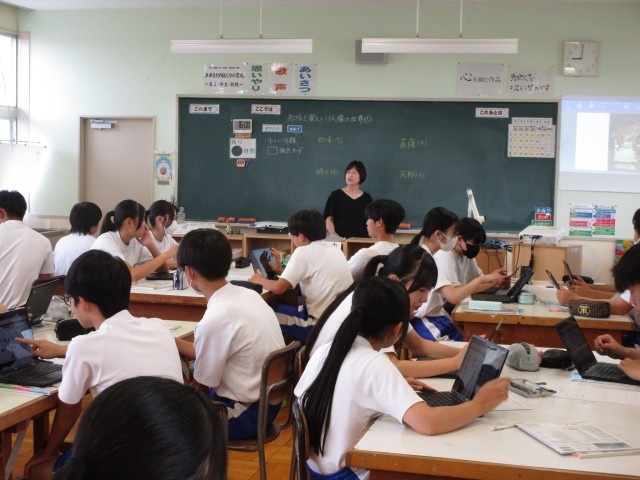 如来、菩薩、明王、天部、それぞれに仏像としての特徴があります。京都奈良への修学旅行を控えた3年生は、興味関心が高く真剣に見入っていました。