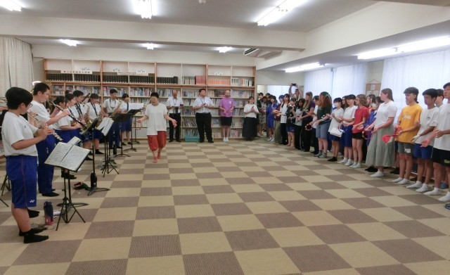 カナダ・リジャイナ市と藤岡市が行っている中学生の交換ホームステイプログラムの一環として、リジャイナの学生と市内の中学生が北中を訪れ、交流を行いました。吹奏楽部のウエルカムコンサート、うどんやおにぎりづくり、藍染め体験、北中生による校舎案内や日本文化の紹介など盛りだくさんの内容に、大いに楽しい時間を過ごしていただけたようです。ご協力いただいたみなさん、がんばって準備をして当日を迎えた北中生のみんな、本当にお疲れ様でした。