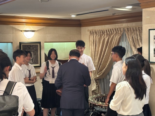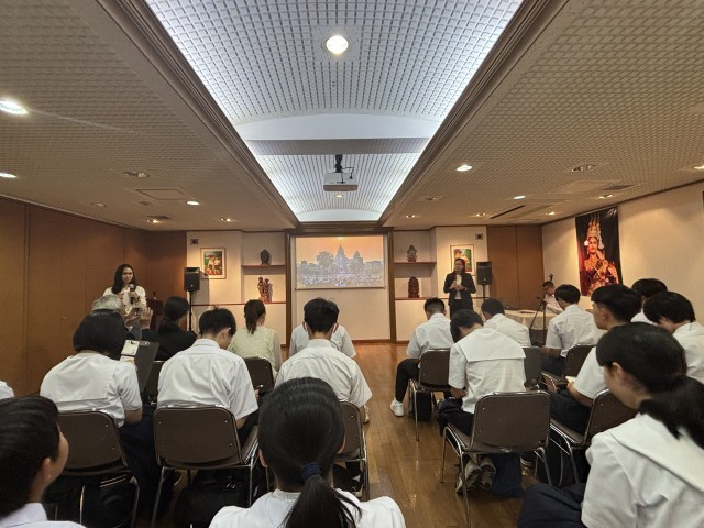 午後は、在日カンボジア王国大使館を訪問し、大使や書記官からカンボジアの歴史や文化、観光、伝統的な楽器などについて説明を受けたり、揚げさつまいもも振る舞われたりと、貴重な体験を通して、カンボジアと日本の関係について理解を深めました。