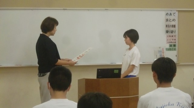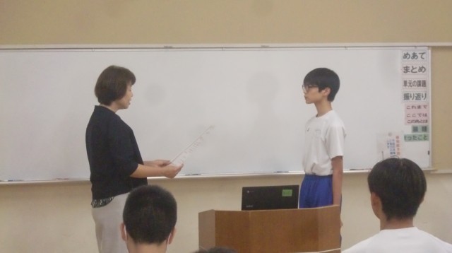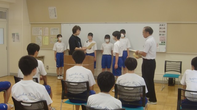 8/29 表彰の様子 公開日 2025/08/29 更新日 2025/08/30 できごと 男子バレー部 県中体連準優勝 関東大会出場生活科学部 「あなたのためのお弁当」コンクール 北中C→最優秀賞 北中A、B→優良賞吹奏楽部 県吹奏楽コンクール中学生Aの部 銀賞女子卓球部 県中体連 団体 第6位入賞バドミントン部 男子シングルス 県優勝 関東大会出場 ※バドミントン部は次回表彰します。